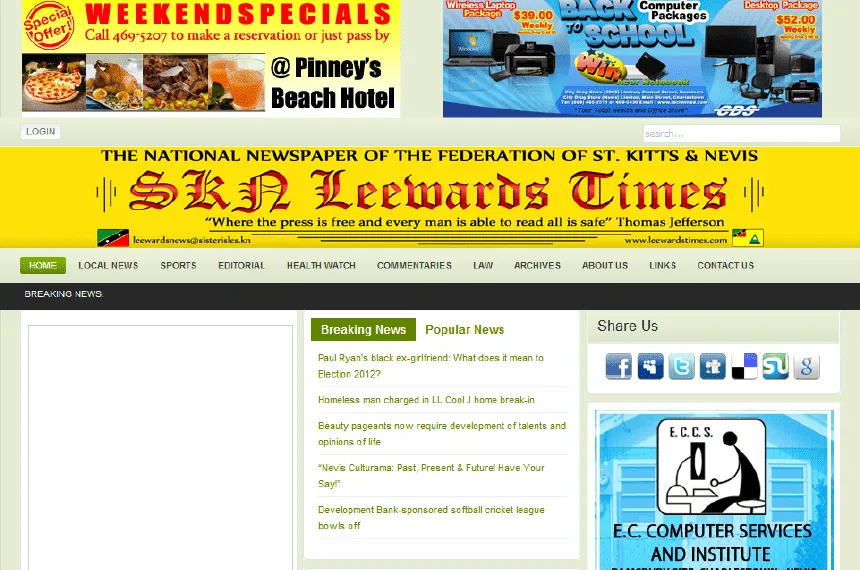 St. Kitts and Nevis News Today. Get the latest news, media, reviews, business, sports, movies, travel books, jobs, education, property, cars and other online reviews.